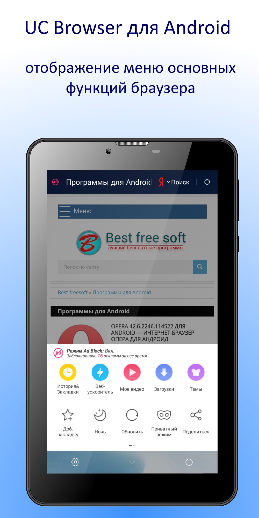UC Browser для Android — бесплатный интернет-браузер, который является одним из самых быстрых среди браузеров для работы на мобильных устройствах под управлением ОС Android и обладает поддержкой функции облачной синхронизации. Имея широкий спектр функциональных возможностей, UC Browser не требователен к аппаратным ресурсам, а также может существенно снизить интернет-трафик, благодаря чему заслуженно признан лучшим Android-браузером.Следует отметить, что высокая скорость загрузки web-страниц браузером стала возможной благодаря использованию прокси-серверов для сжатия контента страниц и некоторым важным параметрам по оптимизации в пользовательских настройках, при правильном использовании которых можно добиться повышения скорости загрузки страниц в итоге в два раза. Помимо этого UC Browser приспосабливается к разным видам сетей. Специальная функция в автоматическом режиме подберет для вашего устройства наиболее оптимальную версию веб-страницы основываясь на типе и возможностях подключенной сети. Так же для экономии трафика в браузере реализована функция «Посмотреть позже», которая записывает всю информацию страницы на устройство, включая изображения и видео, для дальнейшего оффлайн-просмотра позже. Для комфортного чтения в темное время суток в браузере UC Browser реализована функция ночной режим: фон меняется на черный, а шрифт — на белый. А для изменения внешнего вида и увеличения функциональности в UC Browser поддерживается установка тем и веб-приложений, которые можно скачать с соответствующих ресурсов на официальном сайте.