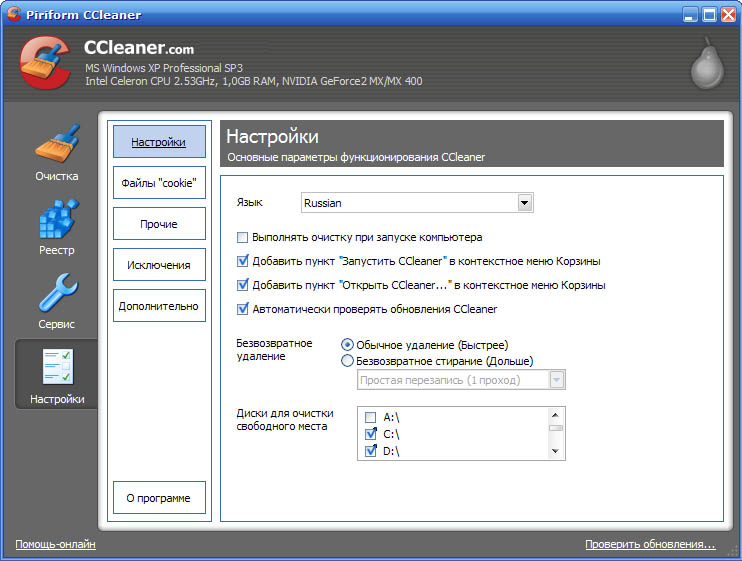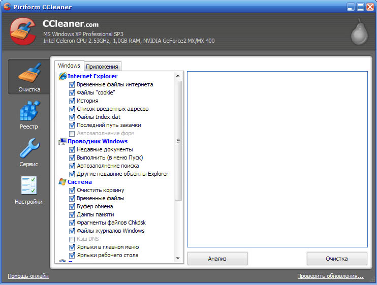 CCleaner чистит следующие компоненты системы: