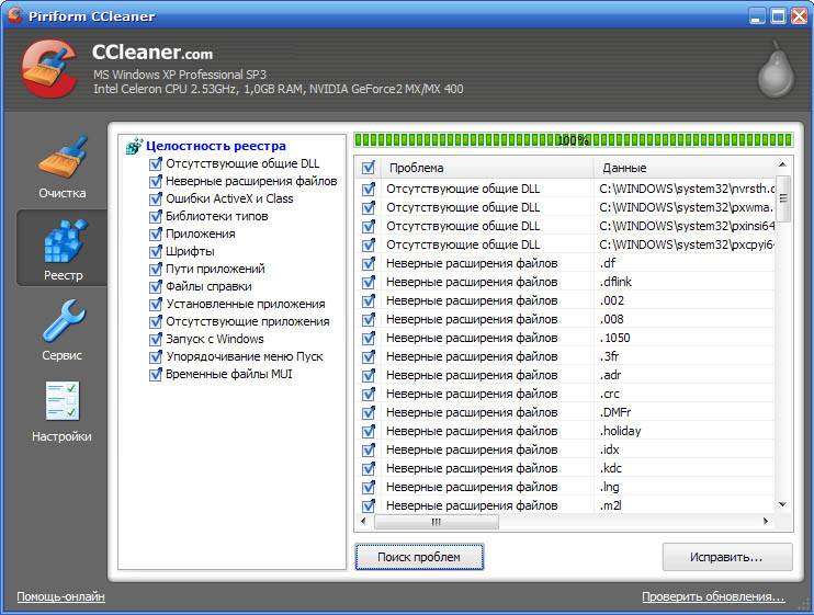 CCleaner использует передовой чистильщик реестра для проверки различных проблем и несоответствий. Он проверяет: